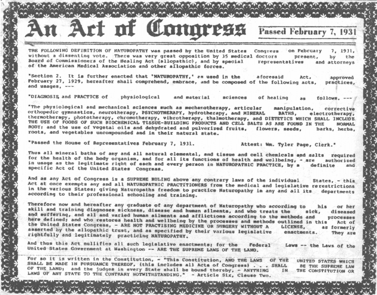 Naturopathy as defined by the Act of Congress, February 7, 1931, is a non-invasive, non-surgical, and drugless healing art of relief from sickness. It utilizes natural methodologies including, but not limited to air, water, heat, light, foods, herbs, fruits, homoeopathy, manipulation, electrotherapy, mechanotherapy, and use of vegetable oils.